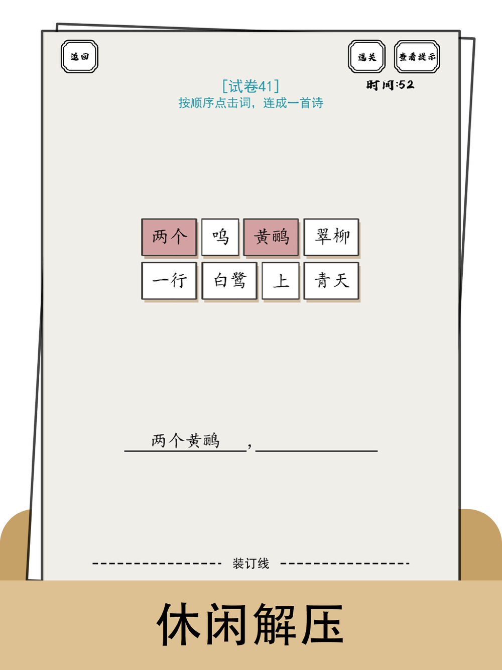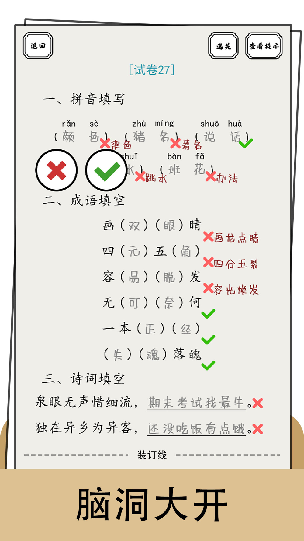 这是一款发动智慧找到作业中错误答案的游戏,游戏中有丰富多样的试卷试题,也有诗词和成语组合试题,游戏轻松有趣使你脑洞大开,快来挑战一下吧。