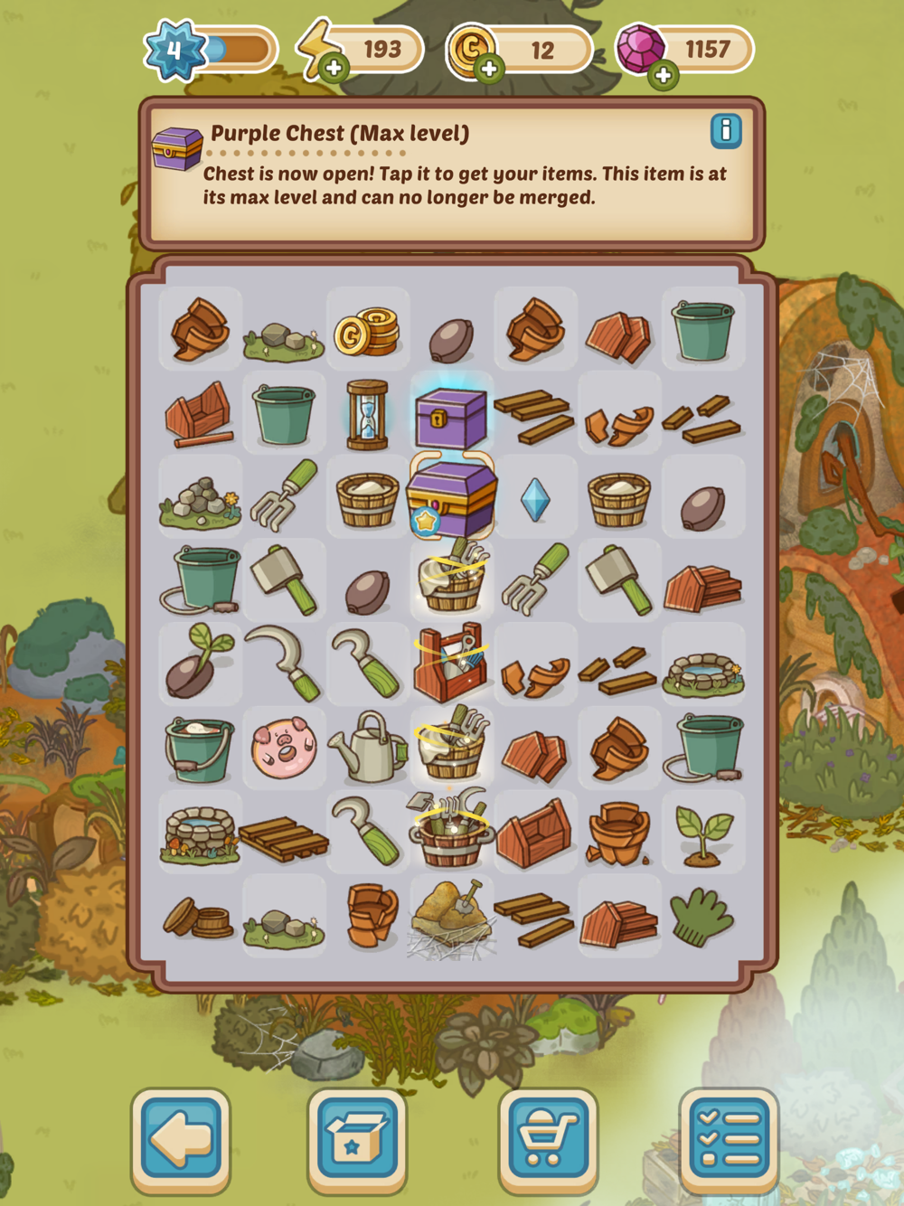 Look for new items hidden behind boxes and cobwebs. Merge them together to find more decorations.