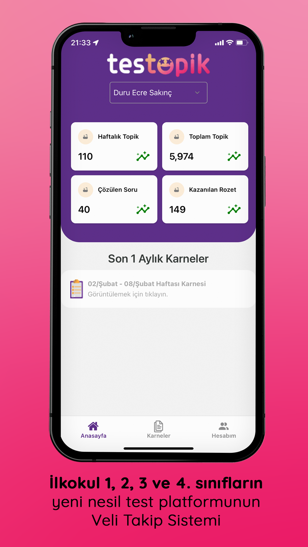 Şu an kullandığınız mobil uygulama ile Testopik platformunu kullanan öğrencilerimizin raporunu haftalık periyotlarla sizlere sunuyoruz. Uygulamamız sizlere her ders seviyesinde öğrencimizin kazandığı puan ve rozetleri göstermesinin yanında, akademik gelişimini de veriler üzerinden takip etme olanağı sunar.