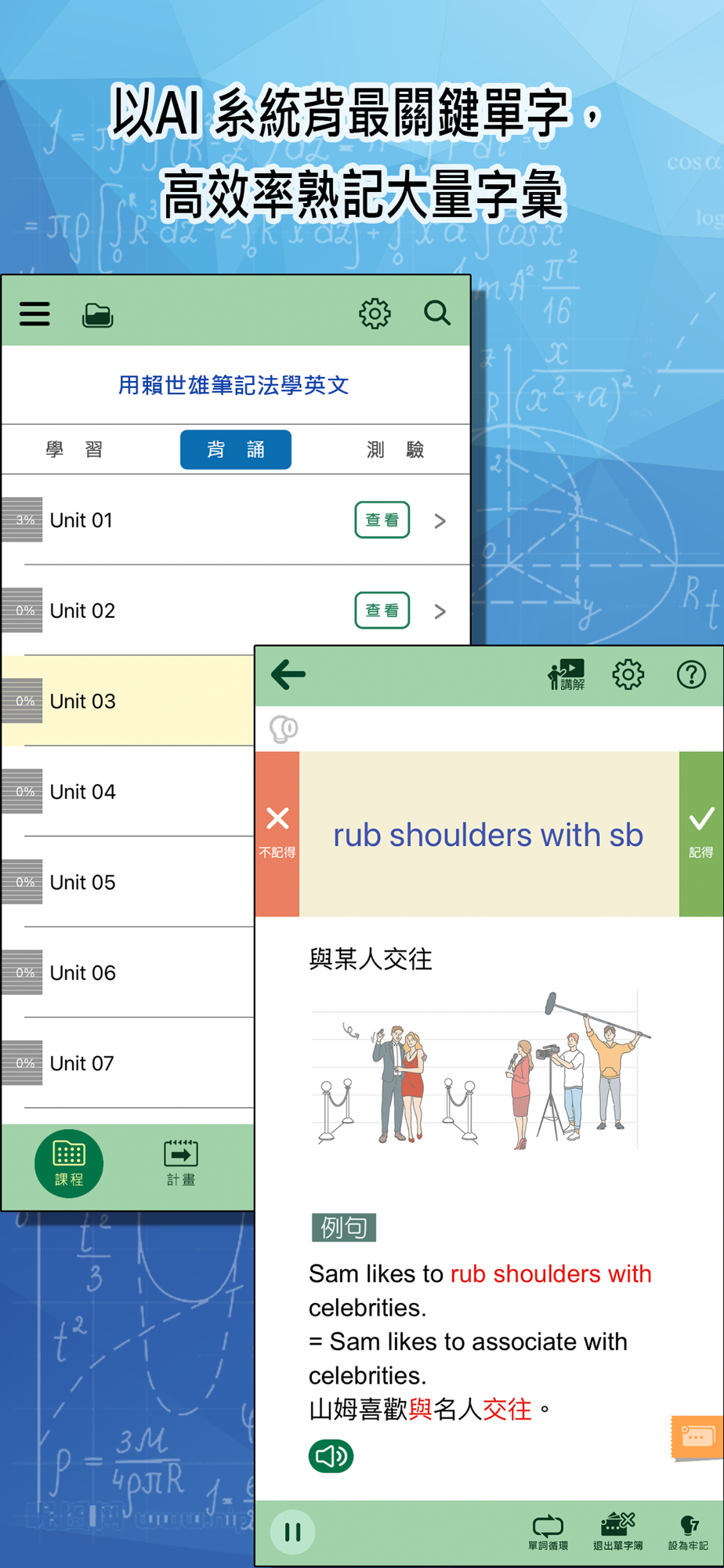 【背誦 / 學習雙模式】:「背誦模式」系統化地背單字,逐步成為長期記憶;「學習模式」可進行系統外的複習。