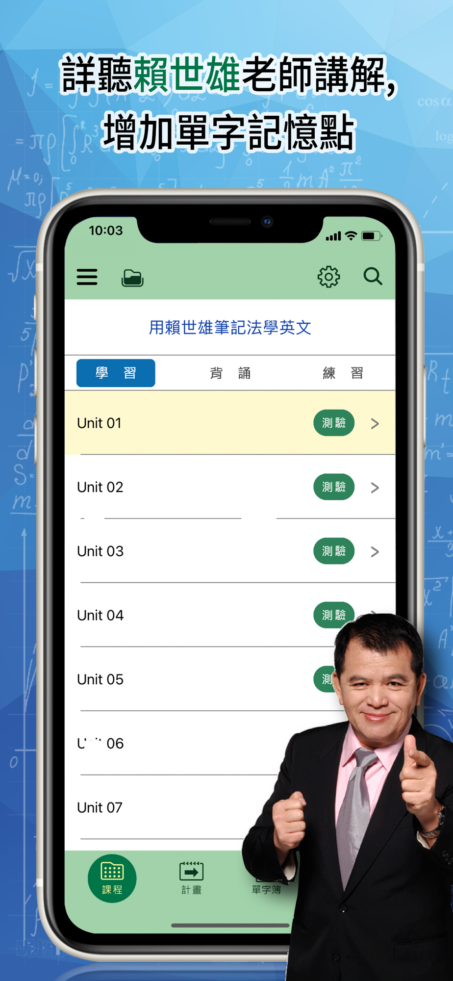 賴世雄老師嚴選720則單字片語親自示範及講解,162段情境對話活用演練,幫助你學好英文,每天10分鐘,提升單字片語記憶力。