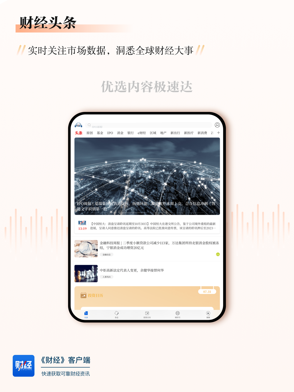 1、全球视野 财经头条:关注全球财经热点,优选内容极速达。传递有深度、有高度、有广度的财经资讯。
