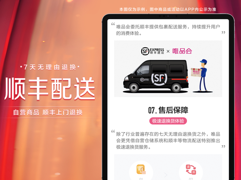 7天无理由退货,自营商品免费上门收件(自行寄回返10元唯品币);