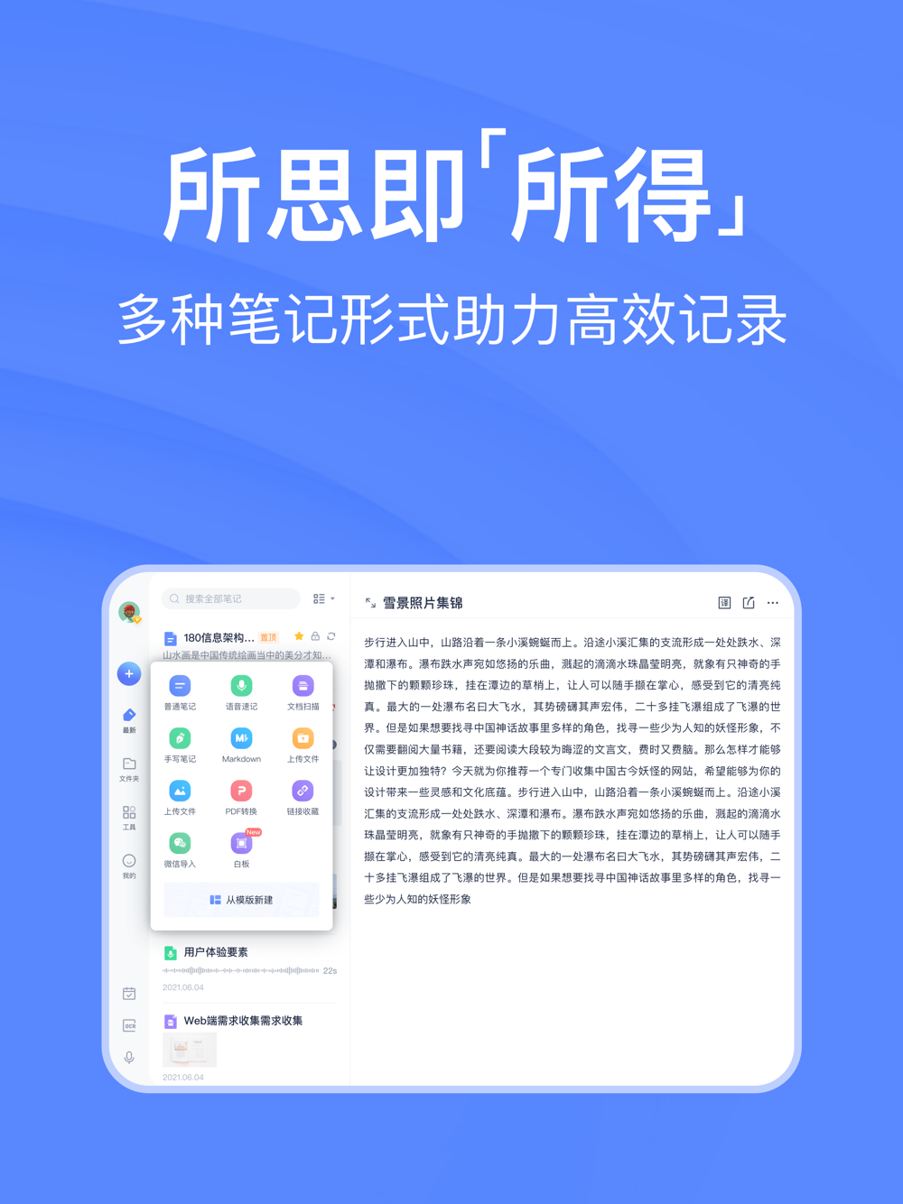 下载有道云笔记,等于同时拥有备忘录、记事本、日记本、笔记本、网盘、扫描仪、录音笔、office、Markdown等多项技能!