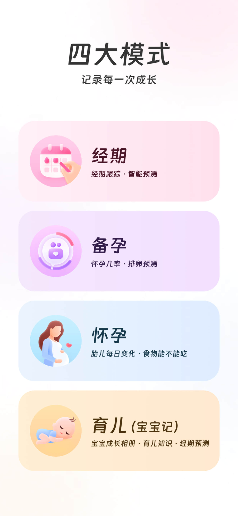 提供经期、备孕、怀孕、育儿四大模式。科学备孕,排卵日一查便知;健康怀孕,知识每日推送,食物能不能吃一查便知;育儿护航,记录宝宝成长每一刻。