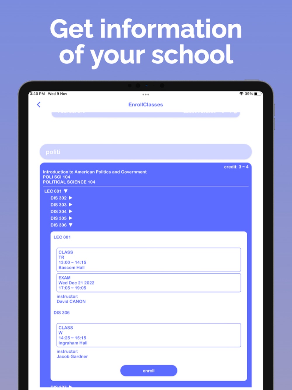 You can plan your course registration and check the timetable through the registered course data. Each subject data is linked to Google Maps to help you get to the classroom quickly.