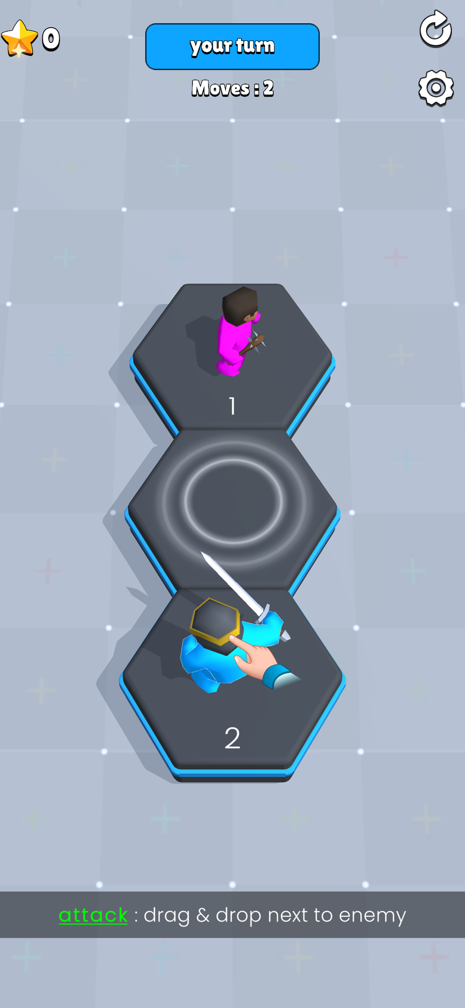 In this turn-based game, players can take two moves in each turn. During each move, they can either merge or attack. The goal is to clear all enemy units.