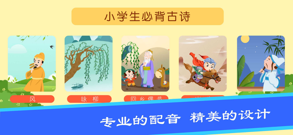 《咏鹅》,《春晓》,《望庐山瀑布》,《赠汪伦》,《枫桥夜泊》,《悯农》,《敕勒歌》,《静夜思》,《绝句》,《鹿柴》,《出塞》,《登鹳雀楼》,《芙蓉楼送辛渐》,《凉州词》,《九月九日忆山东兄弟》,《宿建德江》,《望天门山》,《回乡偶书》,《寻隐者不遇》,《早发白帝城》,《清明》,《观书有感》,《春日》,《送元二使安西》,《小池》,《江雪》,《黄鹤楼送孟浩然之广陵》, 《咏柳》,《乐游原》,《凉州词》,《江南春》,《秋夕》,《游子吟》,《竹石》,《赠花卿》,《题临安邸》,《浪淘沙》,《石灰吟》,《己亥杂诗》,《江南》,《长歌行》,《七步诗》,《风》,《从军行》,《竹里馆》,《古朗月行》,《独坐敬亭山》,《秋浦歌》,《别董大》等等。