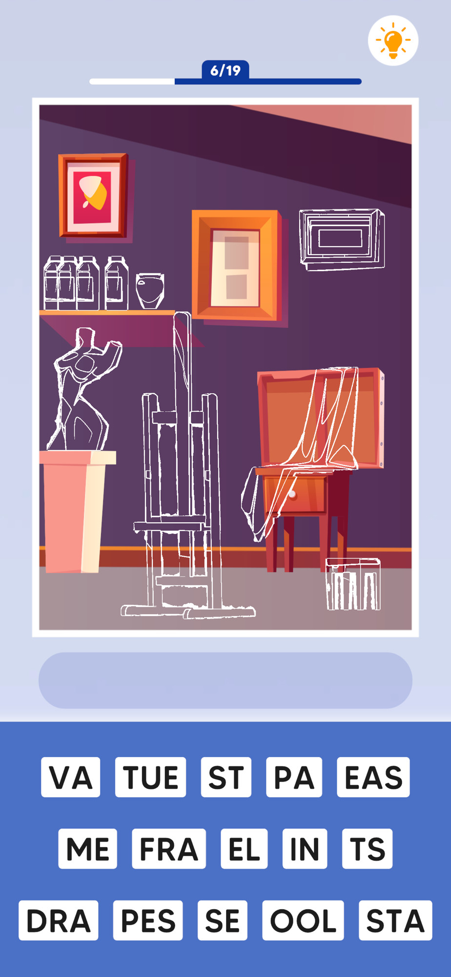 Welcome to Word Art Puzzle! The perfect game to take a break from your day and stimulate your mind. Find the missing elements from beautiful artworks by writing their name. The words are divided in challenging ways to help your brain to think outside the box. After finding all the words, see your art piece coming to life. Are you up for the task?