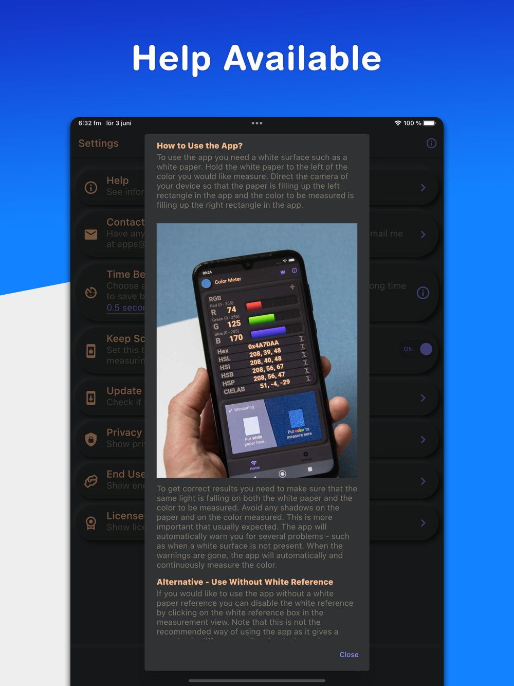 What sets Color Meter apart from other apps is its ingenious use of a white paper reference. By compensating for the color and intensity of the ambient light, Color Meter ensures that the color measurements are more precise and reliable. It is like having a professional meter in your pocket.