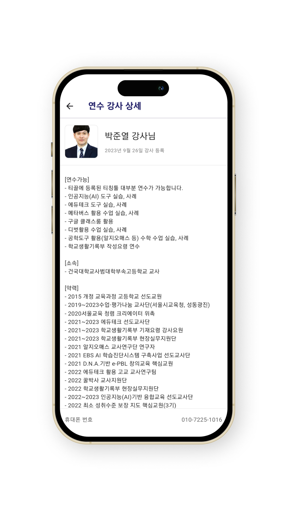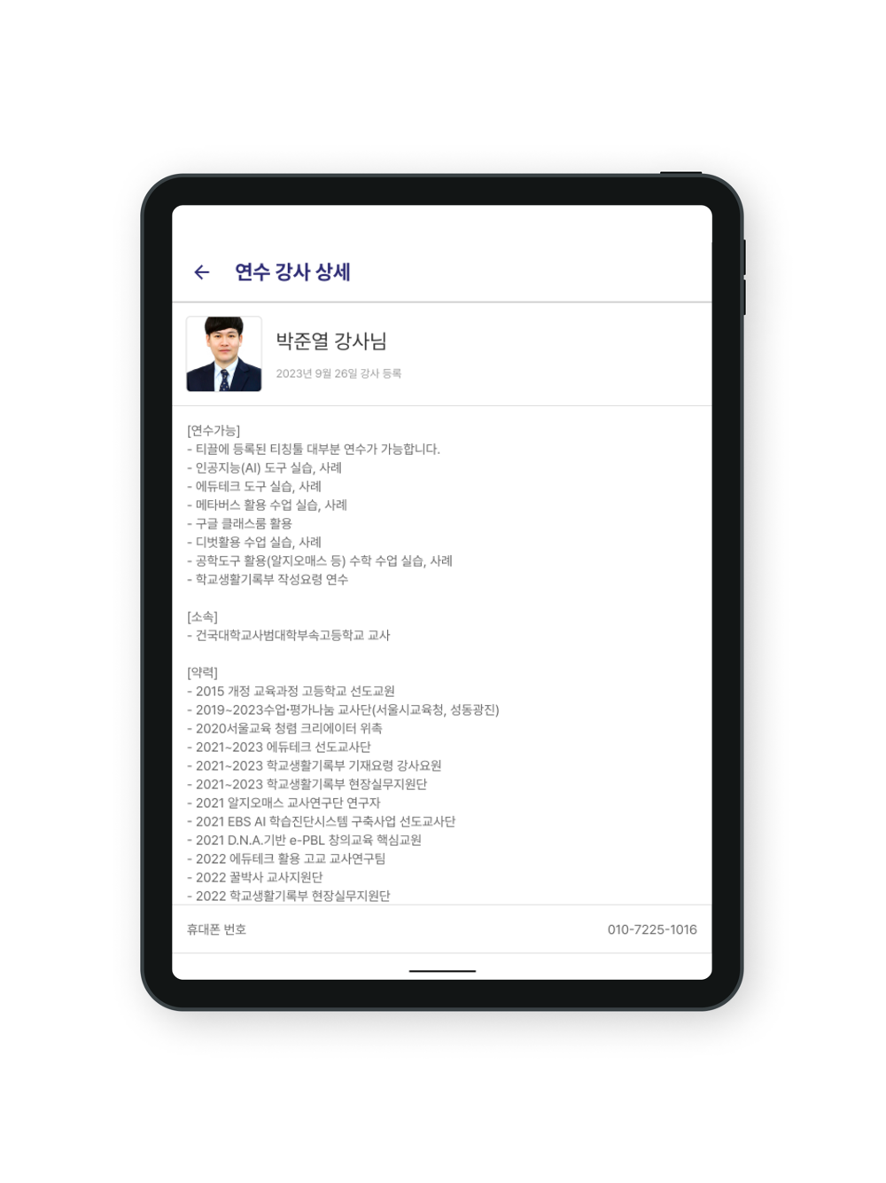 - 연수 강사를 검색하고 연수 강사로 등록할 수 있습니다. 소개를 보고 상황에 맞는 연수 강사에게 연락하세요.