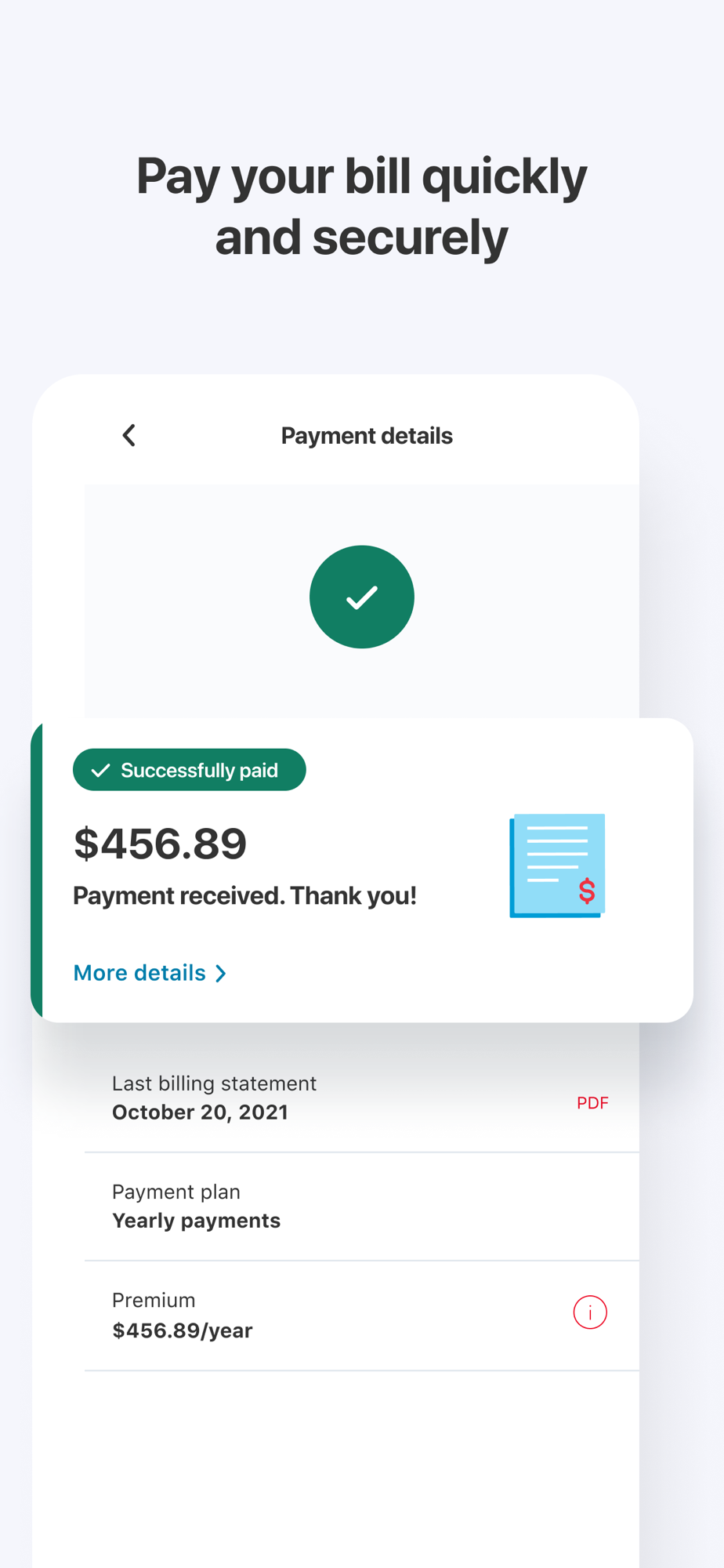 Submit and track a car or home insurance claim in a couple of clicks at your convenience. You can easily add photos of the damages along with any receipts.