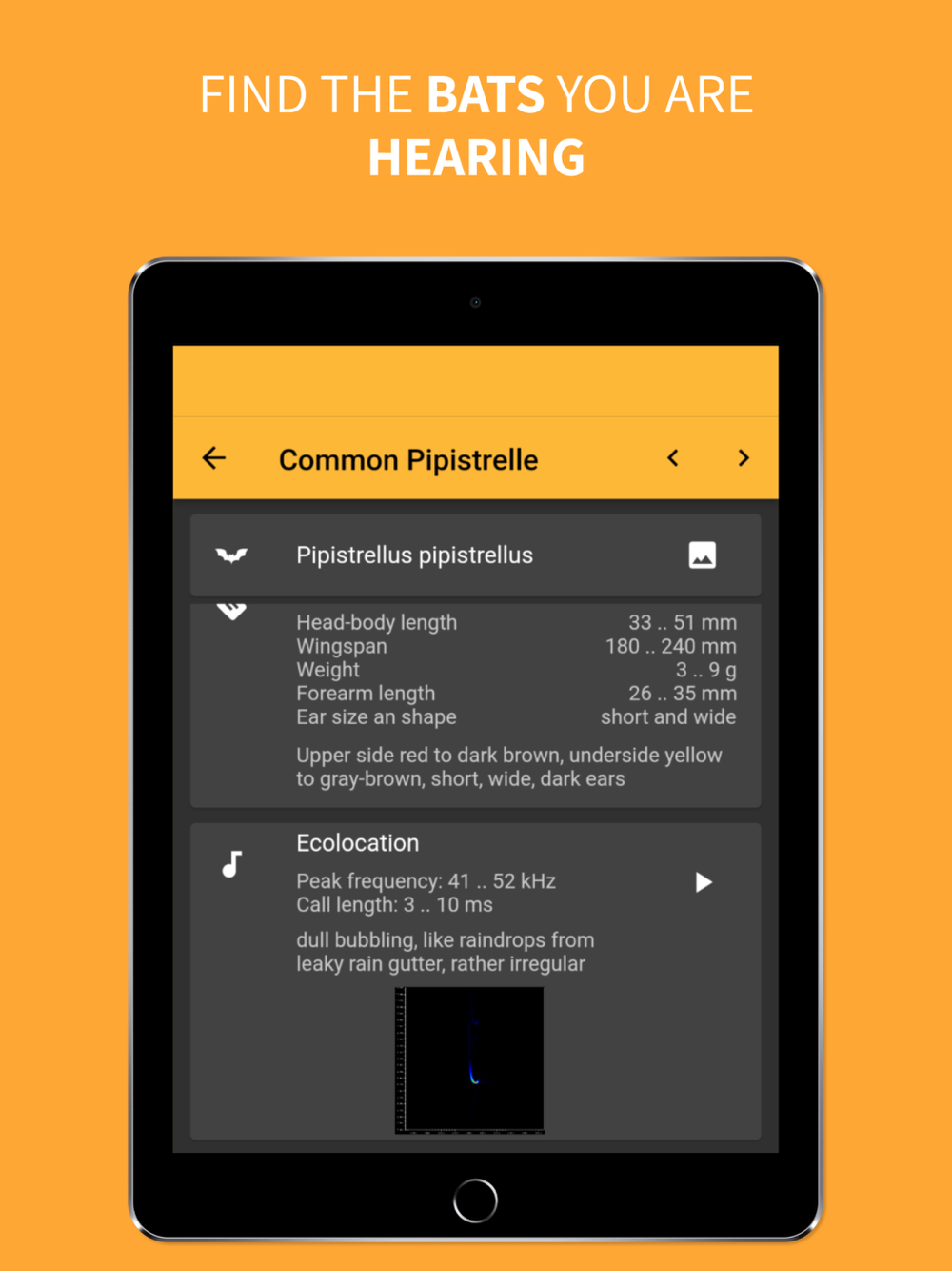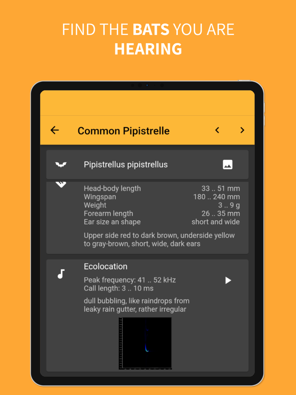 The BatLib app plays the different ultrasonic calls of most European bats, transformed into the audible range using the heterodyne mixer method.