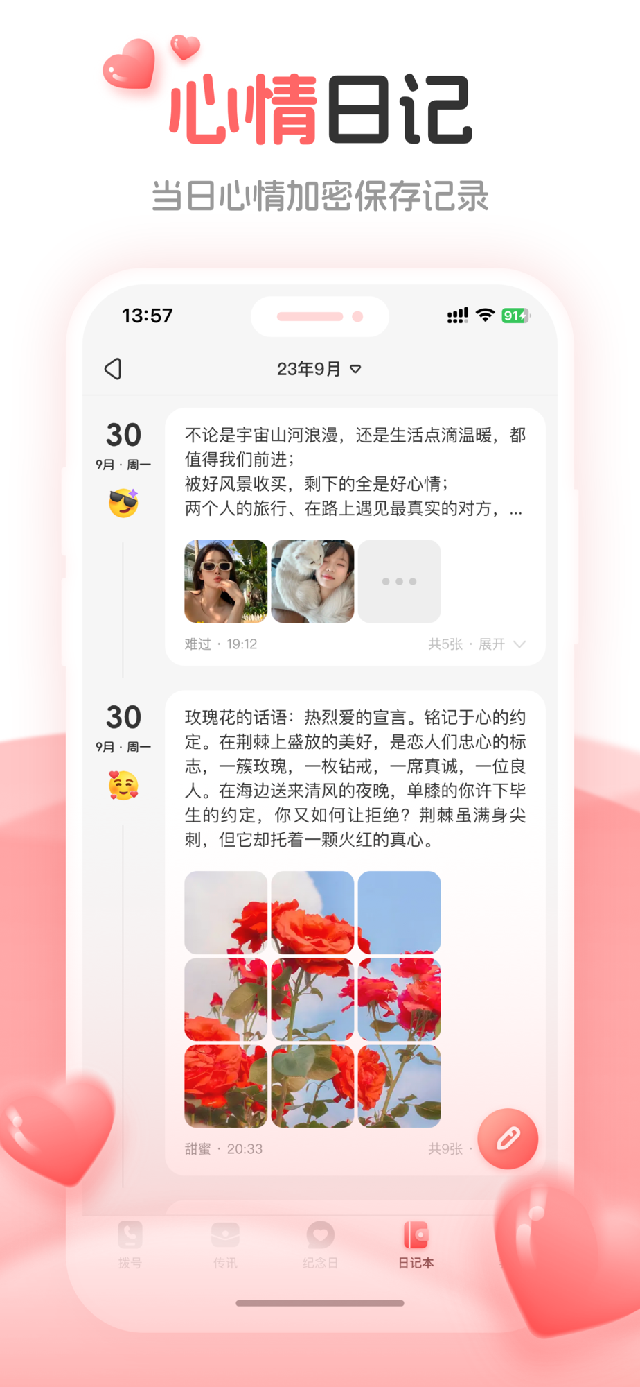 以当日的心情来开始记录,填写文字、添加图片将日记变得更丰富吧