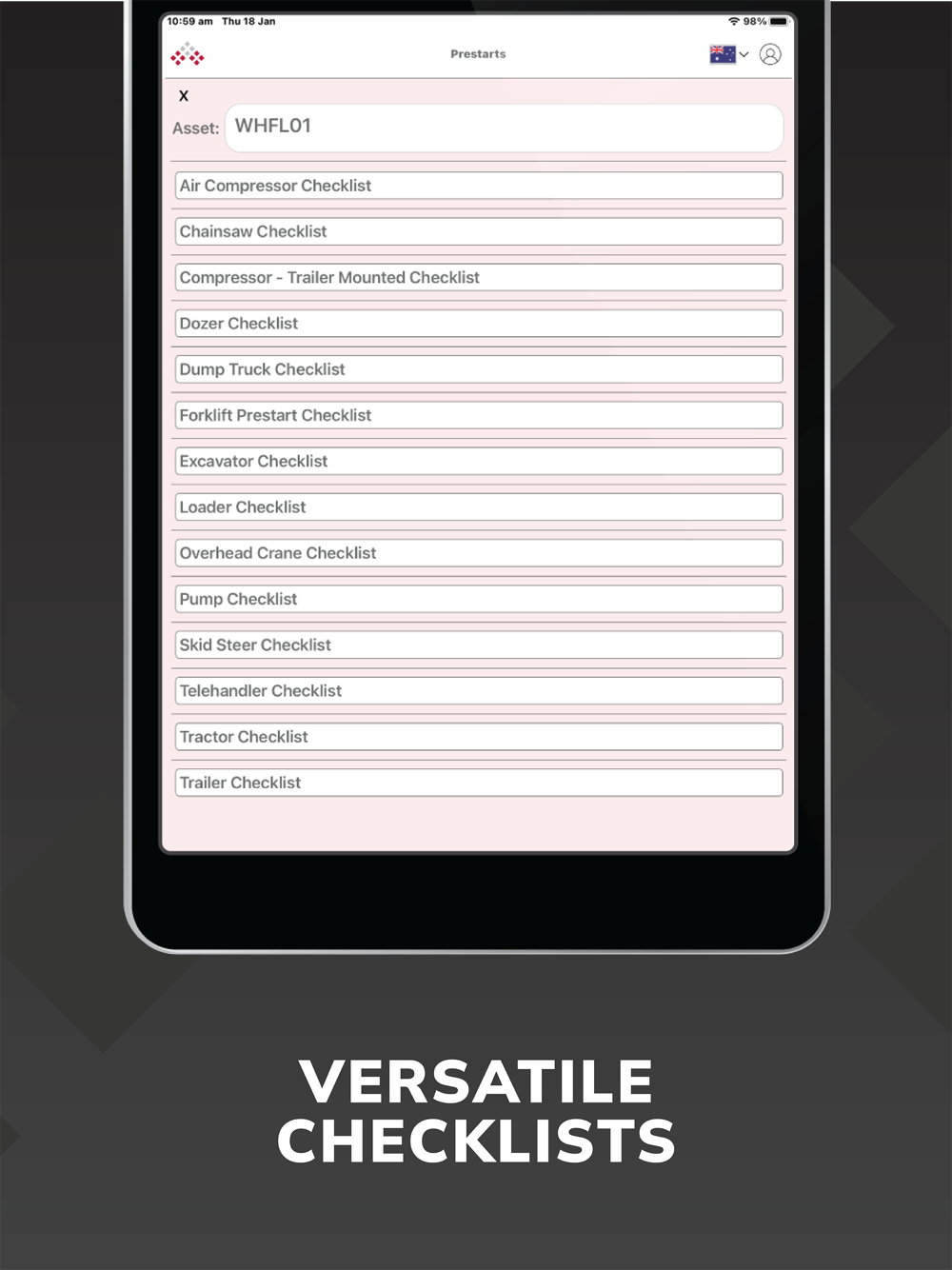 - Choose from 15 prestart checklists available by default in the system, tailored to diverse equipment and operational requirements.