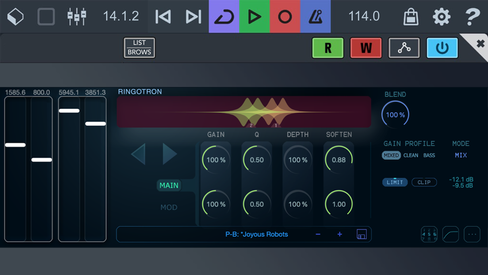 Its multi-band design enables fine control over which parts of the spectrum will be transformed by the effect. A special soft mode is available that borrows concepts from feedback modeling, which can be used to reduce intermodulation effects that are often a limiting factor in the more general applicability of ring modulators.