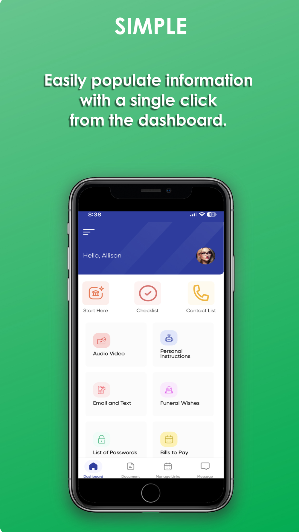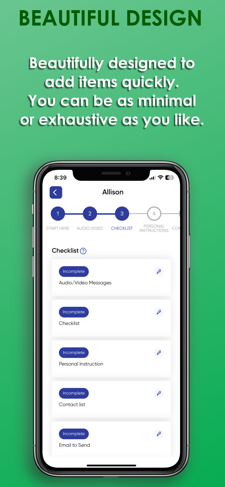 We have made the process extremely simple, with help modals on every screen. There is a checklist that will provide visual clues as to what is complete, what still needs attention and what does not apply to your situation. Record personal videos for friends and family and create emails and text messages that will be sent after you pass. Create Personal Instructions, list any Litigation you are involved and don’t forget to detail where any Personal Information may be located.