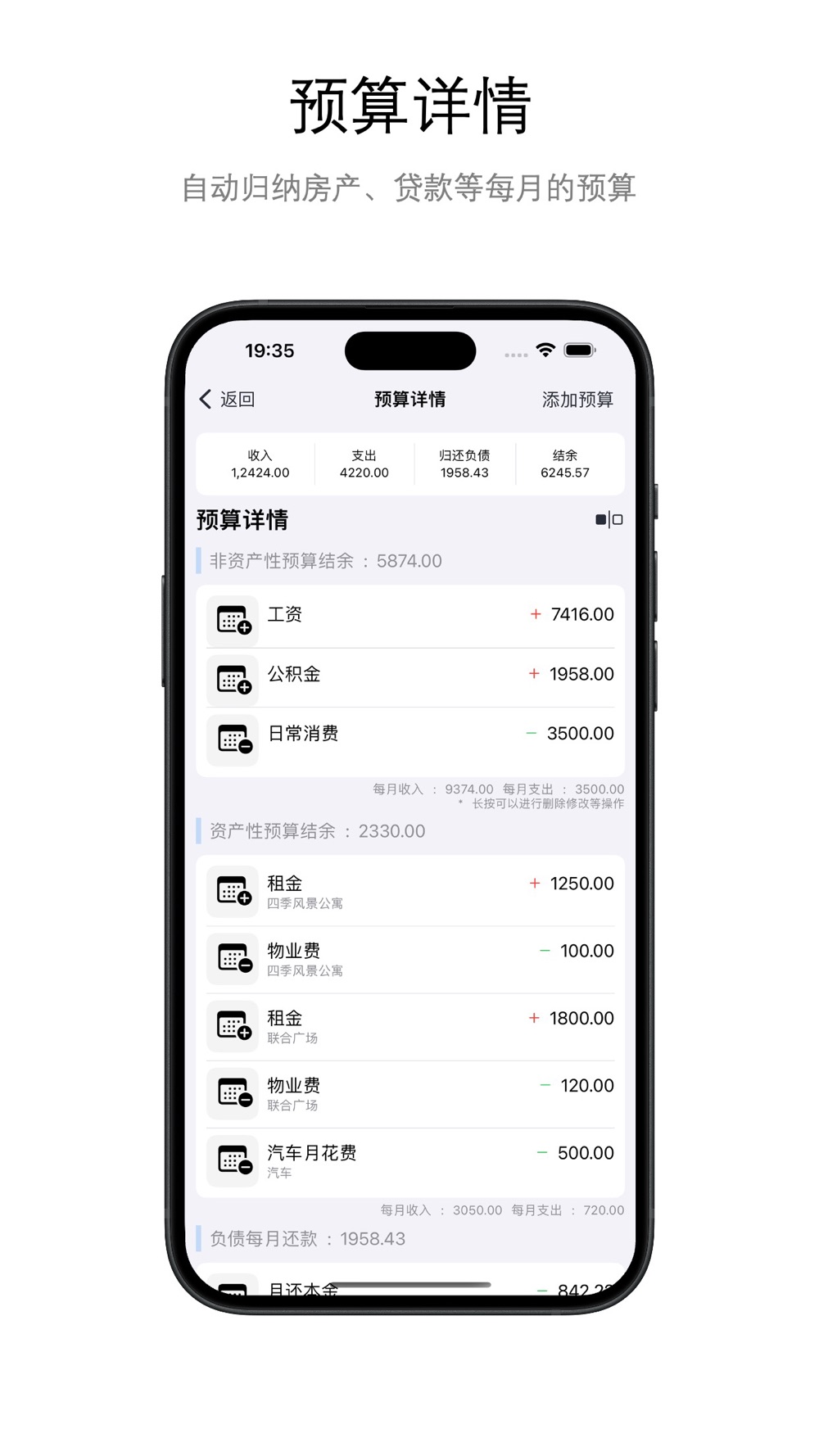资产记录、定期理财自动计算、股票基金自动更新净值、按揭贷款自动计算、资产分布、资产趋势、资产负责健康分析等
