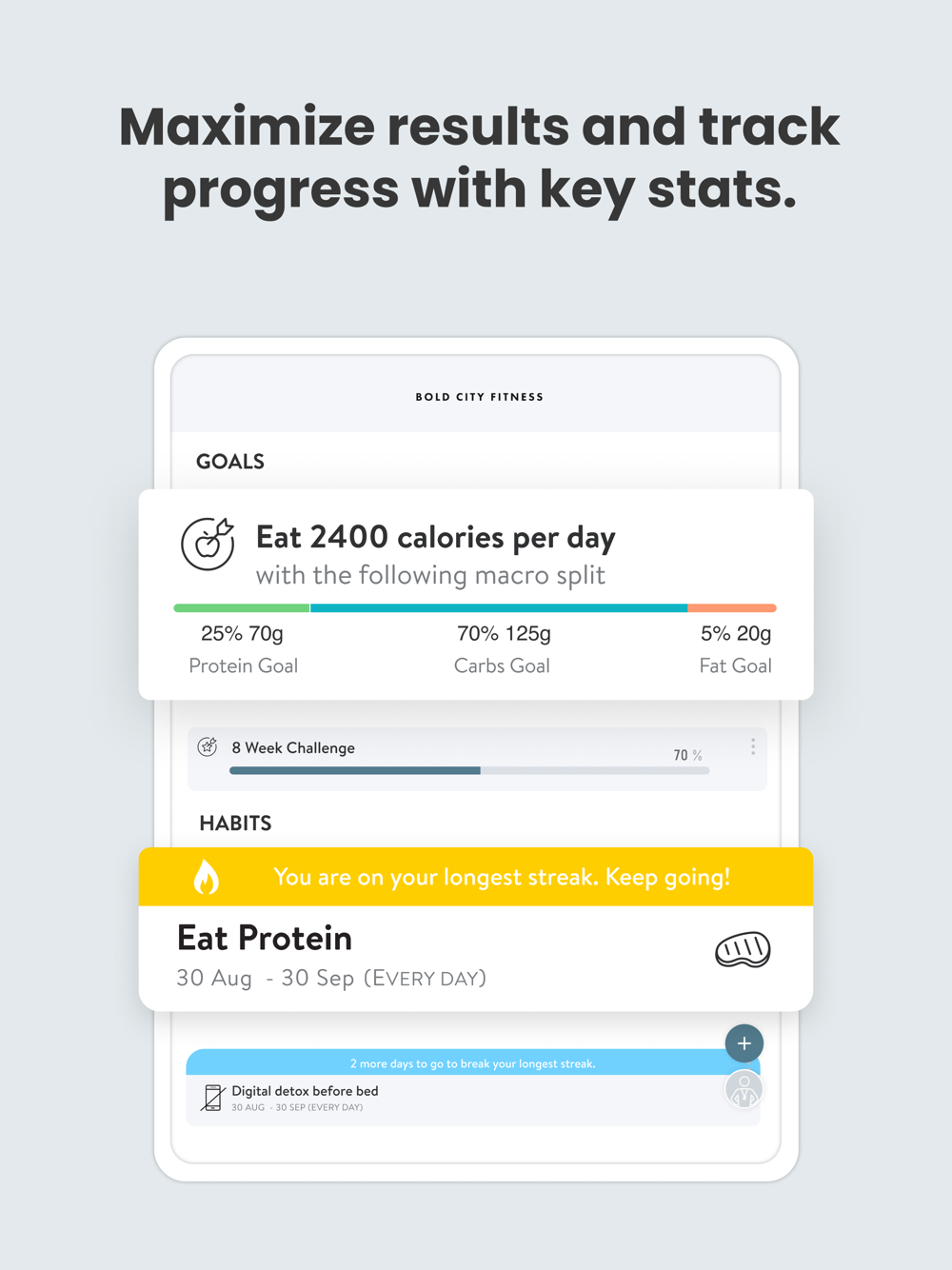Embark on a personalized path to achieving your health and fitness goals with the Bold City Health App. Crafted by experts, our platform offers a holistic approach to wellness, empowering you with the tools you need to succeed. Whether you're tracking workouts, nutrition, or daily habits, your coach is just a tap away to guide you every step of the way.