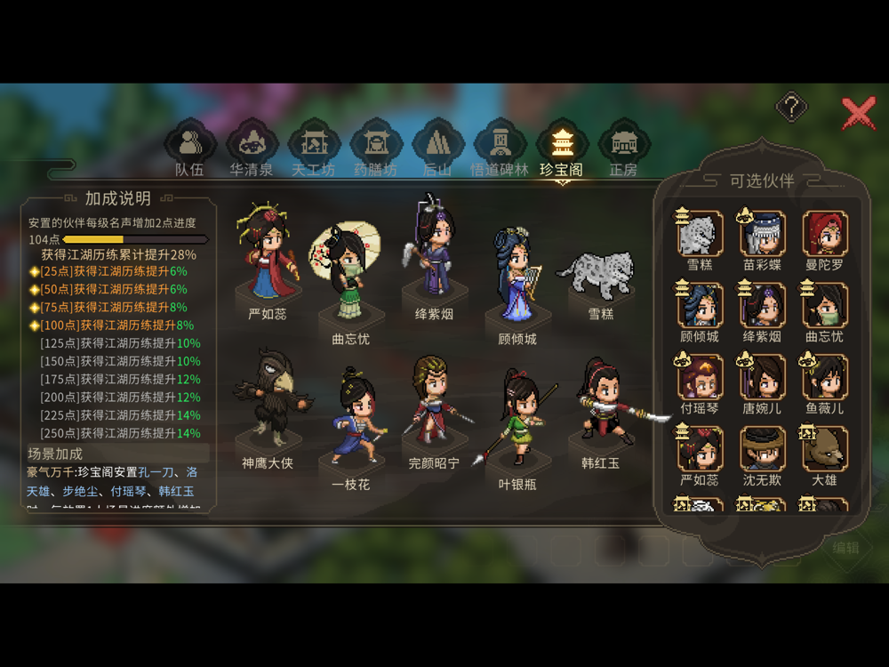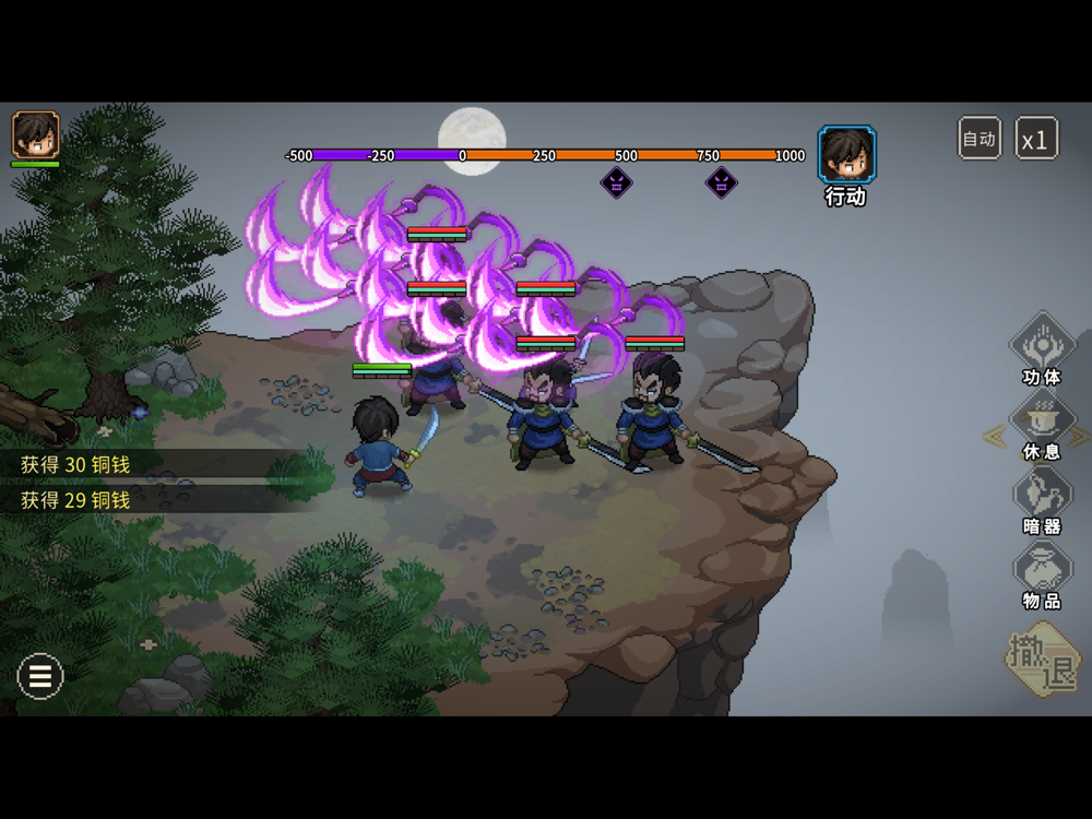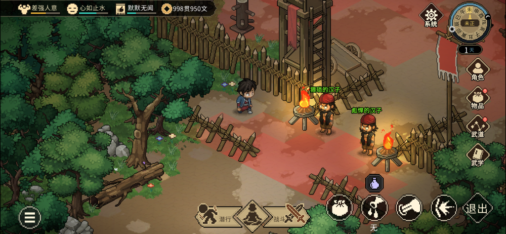- 充满烟火气息的像素武侠世界。游戏中有着自然流逝的时间,各色NPC都有自己独立的行为AI。