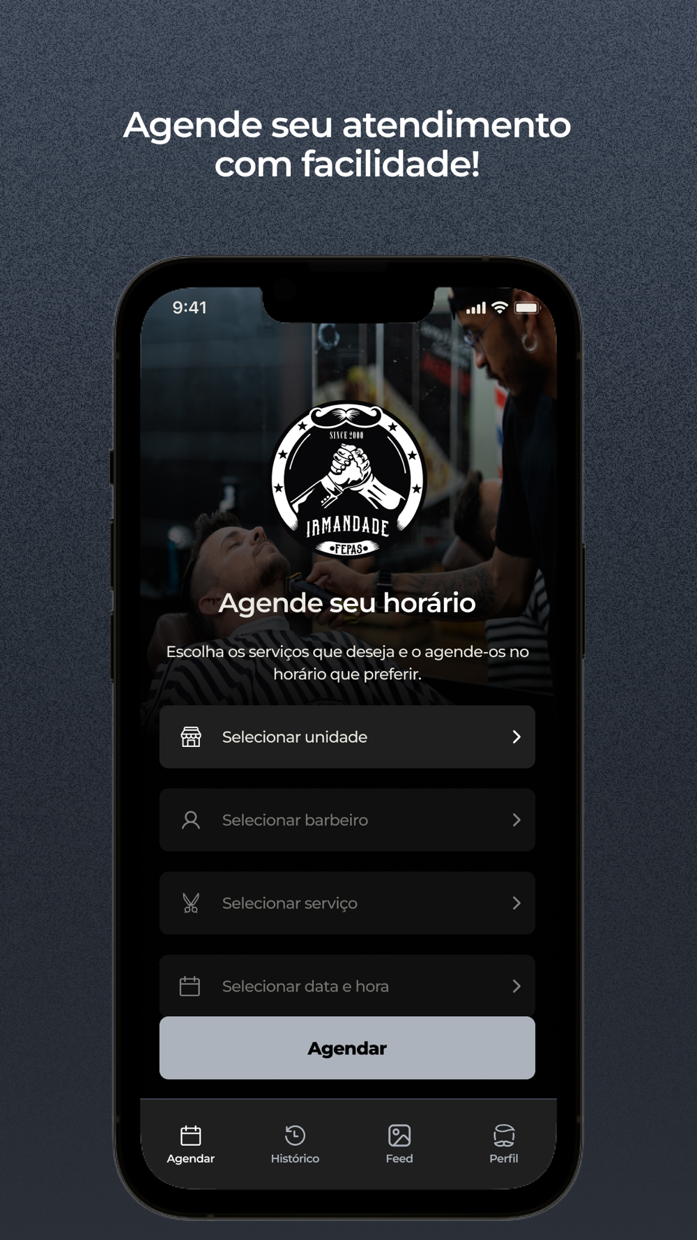 Através do App Barbearia Irmandade Fepas os clientes podem realizar seus agendamentos de uma forma muito mais prática. Na tela inicial, é possível selecionar os serviços e horário desejado para seu próximo atendimento. Já na tela de histórico, você poderá avaliar como foi o seu atendimento, remarcar ou cancelar seus agendamentos. É possível também na tela do perfil o cliente editar suas informações, como e-mail, foto de perfil e telefone.