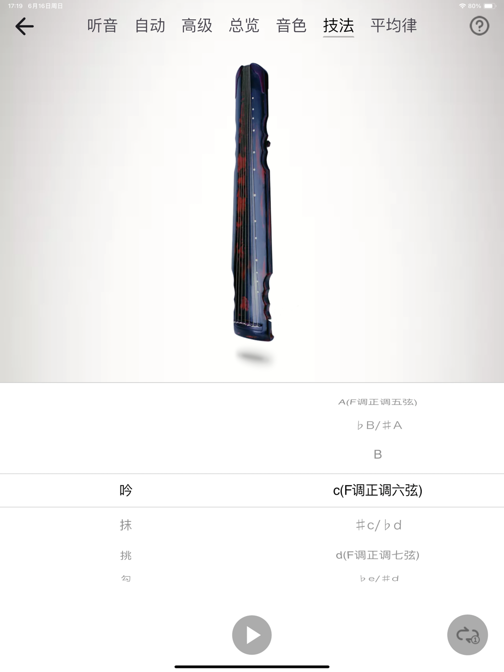 其中,古琴技法,提供:吟、抹、挑、勾、剔,共5种古琴技法;