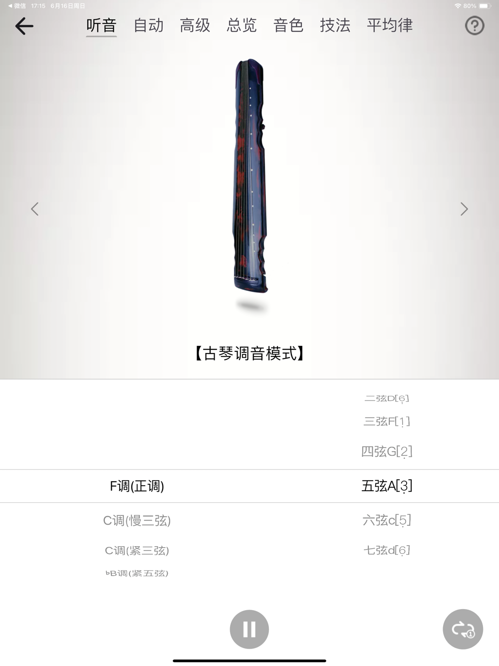 调音器,提供:听音模式、自动定弦、调音色、高级校音、古琴技法、十二平均律、总览,共7种调音模式;