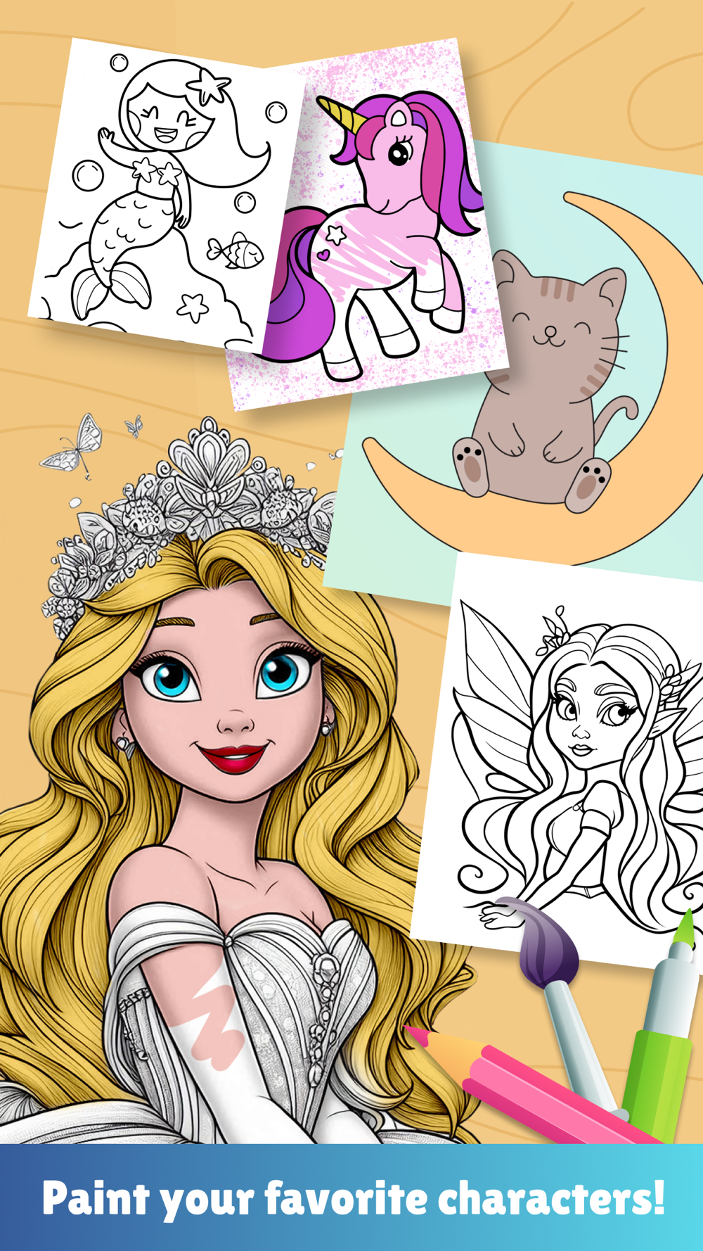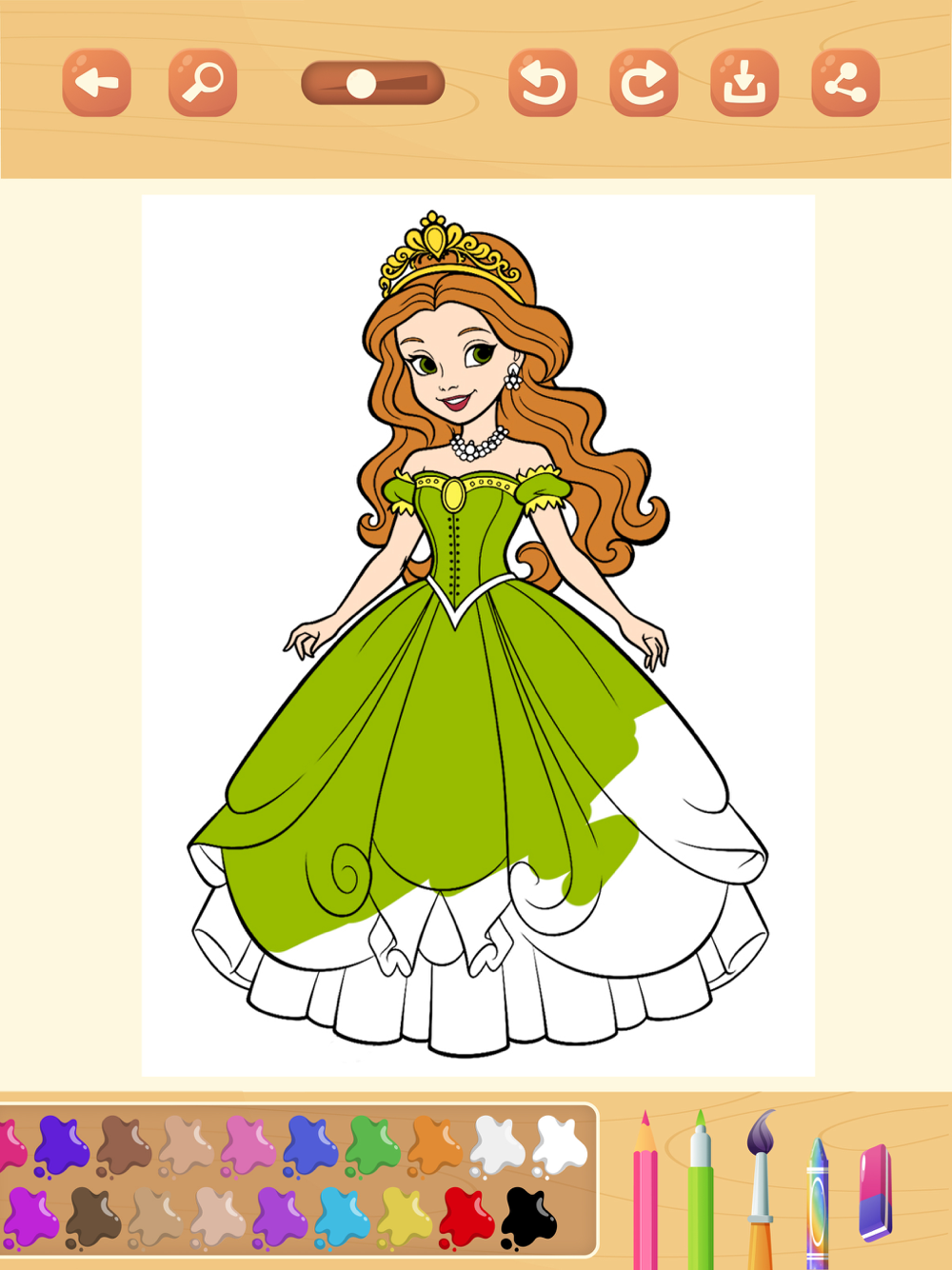 Do you love coloring pictures of princesses, fairies and unicorns? This app is perfect for you! We have selected the most beautiful images of the most important princesses, with their wonderful clothes, makeup and much more. Download the app now and start painting and drawing in this incredible coloring book.