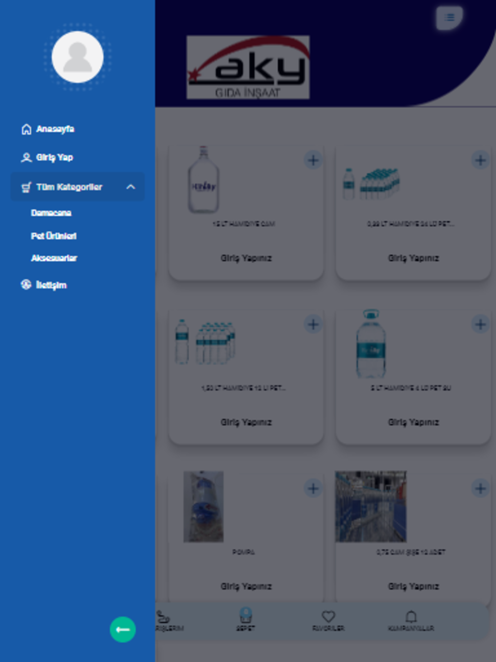 Aky Gıda Mobil Sipariş Uygulaması ile sipariş vermek artık çok kolay! Damacana, Cam Damacana, Pet ve Bardak Su siparişlerinizi uygulamadan verebilir, kredi kartı ve kapıda nakit ile ödeme yapabilirsiniz.