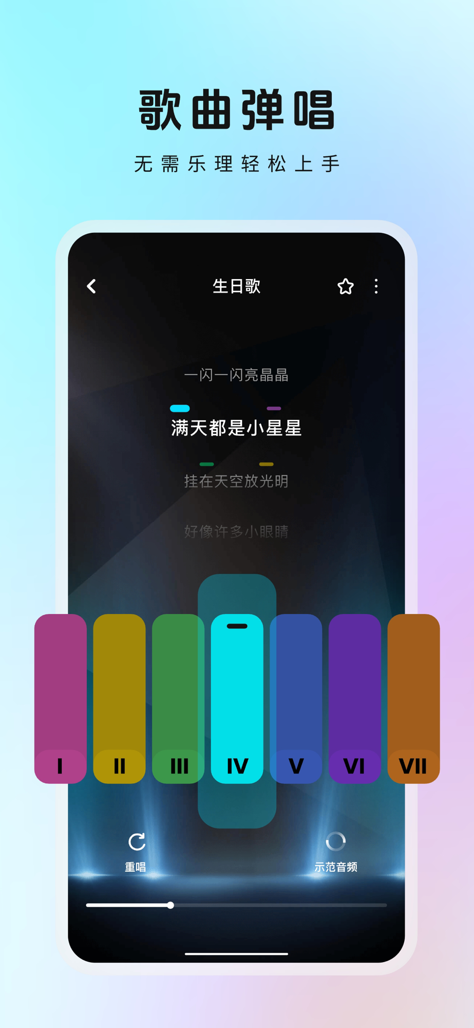 3. 吉他弹唱:在app上打开任意弹唱曲谱,智能吉他上屏幕及琴身提示灯将跟随联动,实时提醒和弦推进,帮助用户轻松入门弹唱