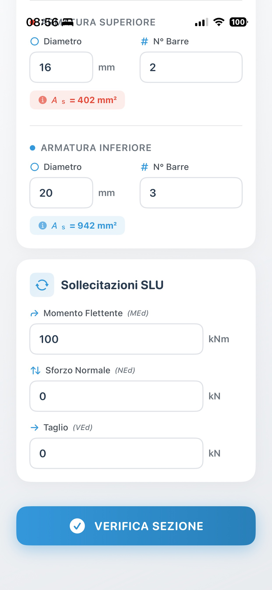 Tutti i calcoli seguono rigorosamente le indicazioni delle Norme Tecniche per le Costruzioni 2018 e dell'Eurocodice 2. L'app implementa correttamente il diagramma stress-block rettangolare per il calcestruzzo e il legame costitutivo bilineare per l'acciaio.