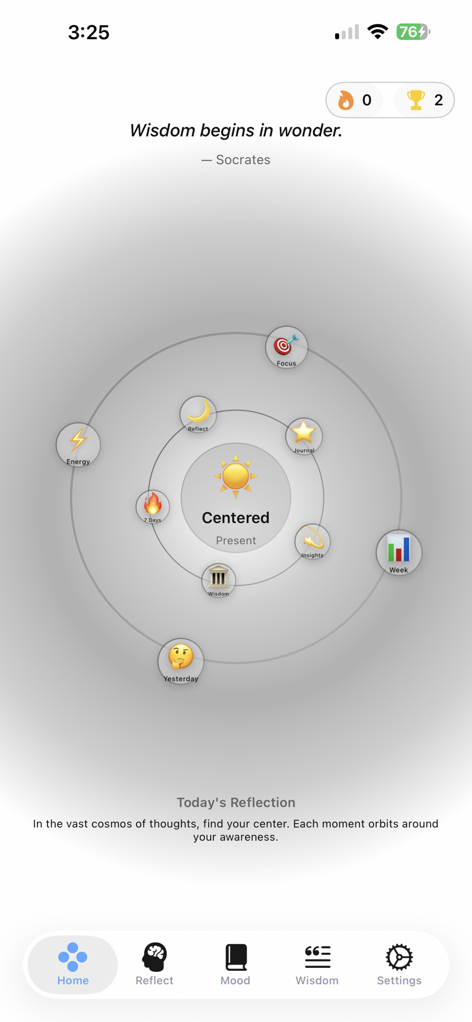 • Purposeful flow: Mood → Reflection → Wisdom. A simple sequence you can return to in under a minute.