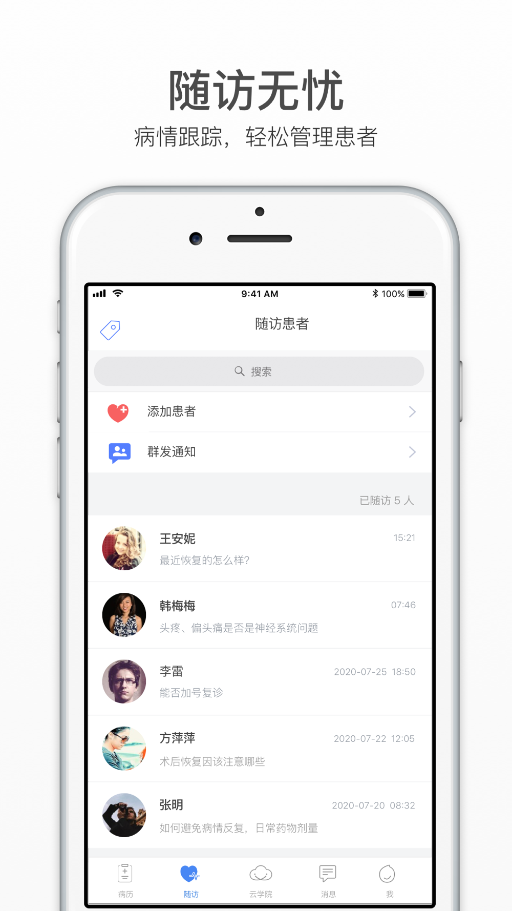 - 与微信无缝对接,便捷随访病人,却无需暴露医生手机号微信号,智能化管理病人关系。