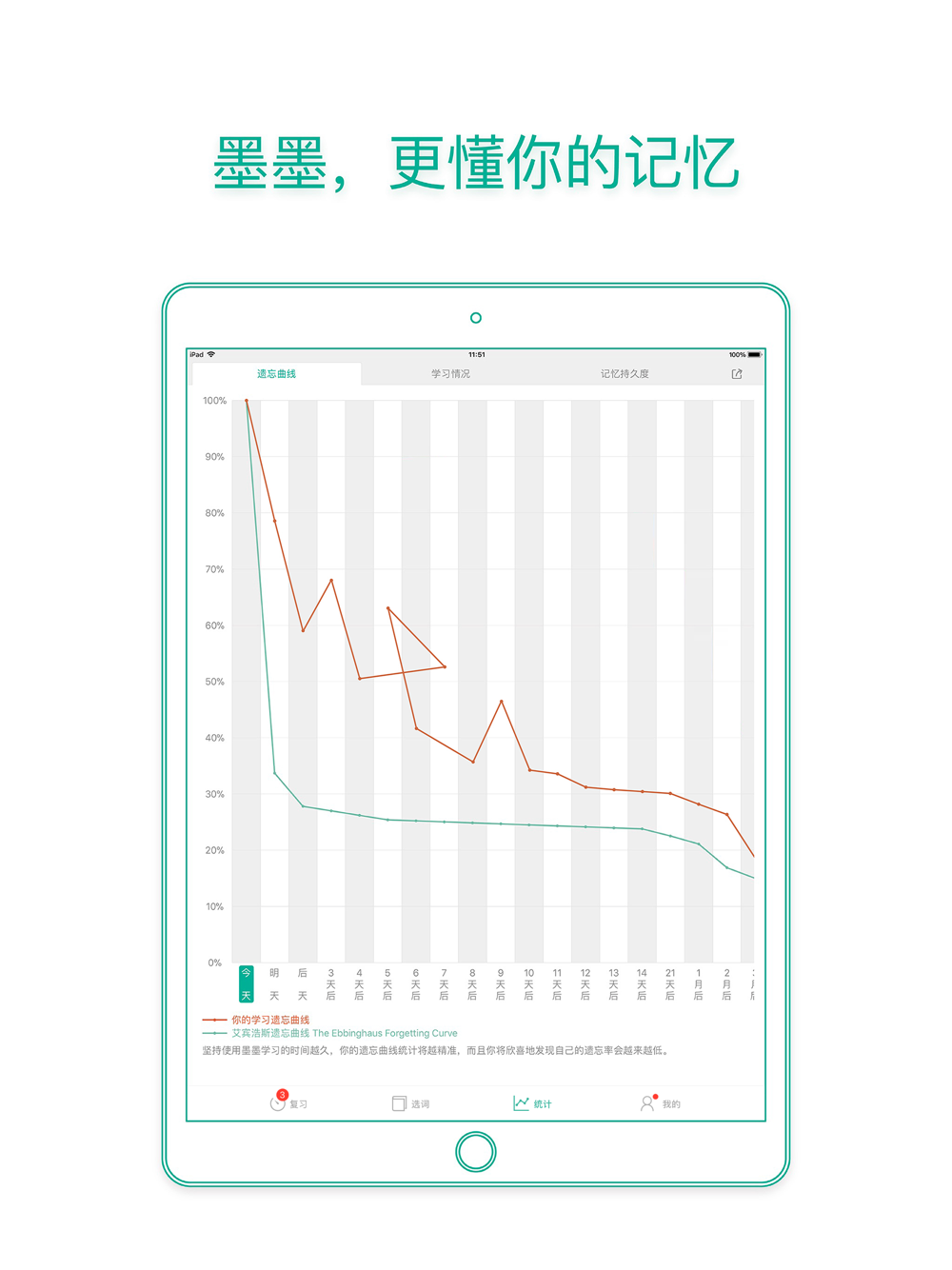 * 遗忘曲线:真实反映了你在每个阶段对已学单词的遗忘率;