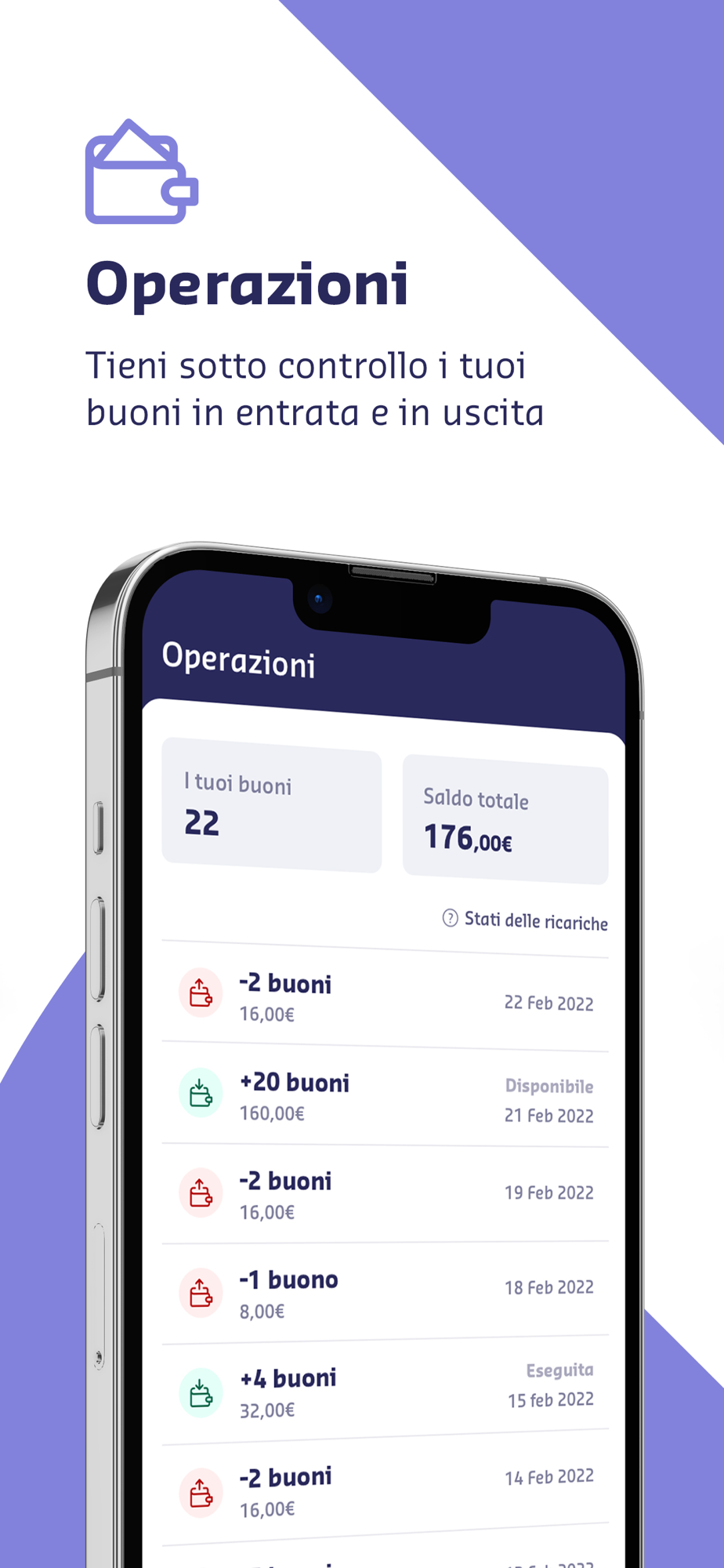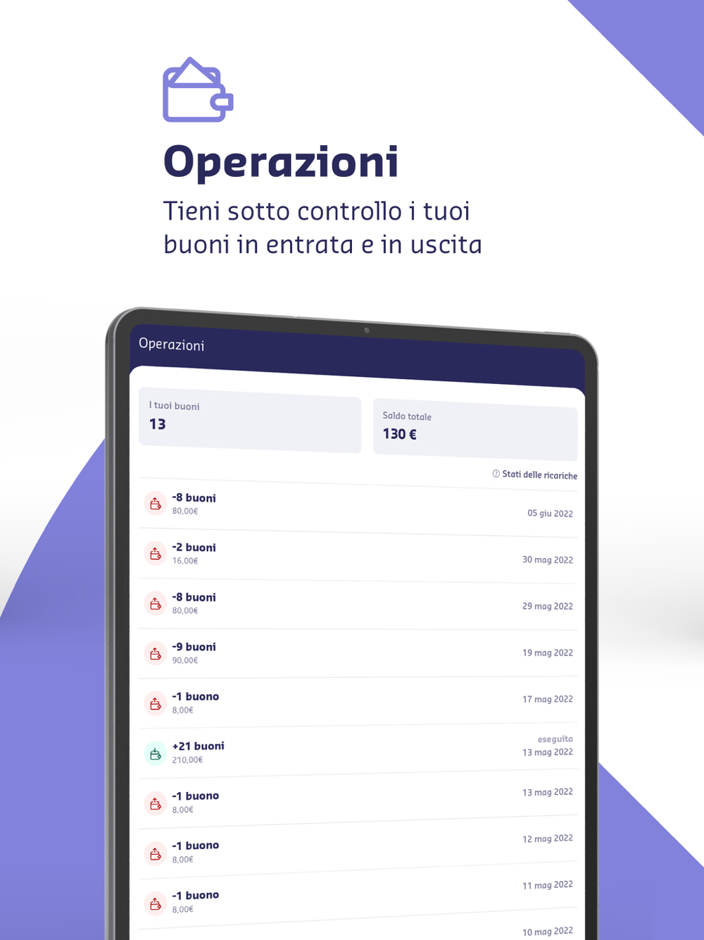 - visualizzare il saldo dei buoni pasto e avere sempre sotto controllo, in un’unica sezione le operazioni effettuate, in entrata e in uscita.