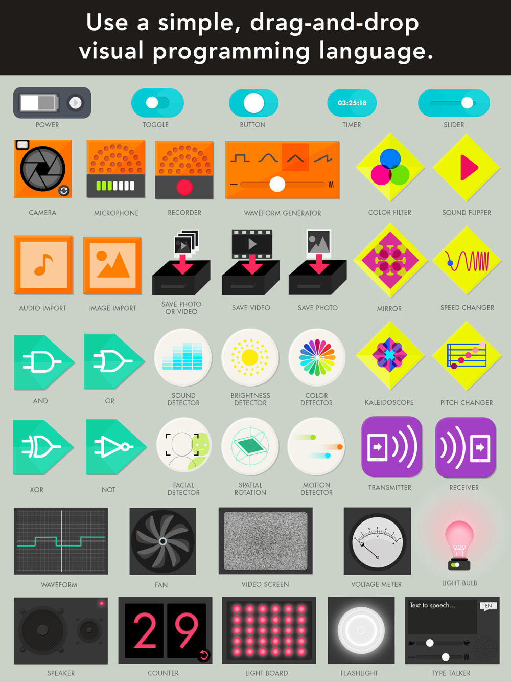 A simple drag-and-drop visual coding language lets you connect and control your device’s camera, sensors, lights, sound, and more. Make a light, a stop-motion camera, a kaleidoscope, a voice disguiser, or anything else you can think of!