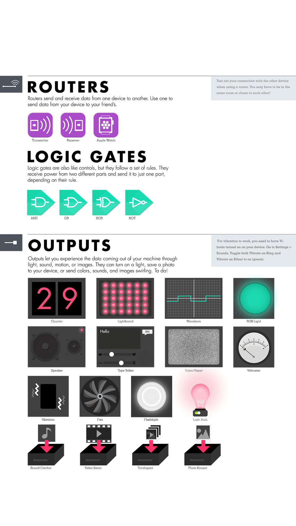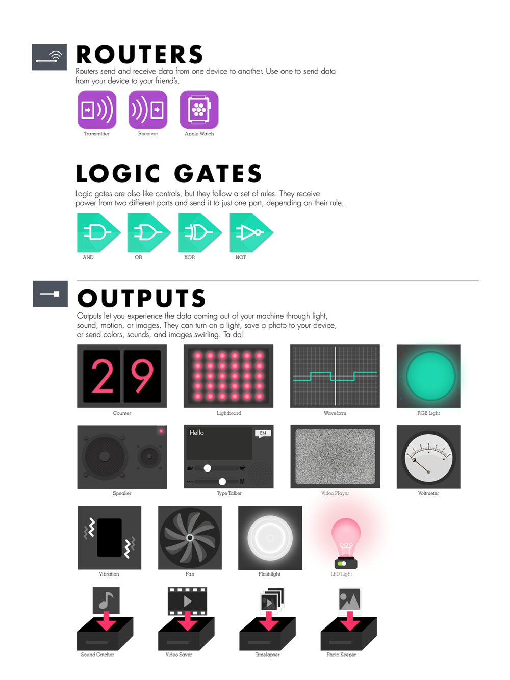 Download the free Everything Machine Manual for instructions to start building quickly with a picture-swirler or cookie-thief catcher. The manual also explains inputs, outputs, logic gates, routers, and more. Learn the basics of coding and circuitry.