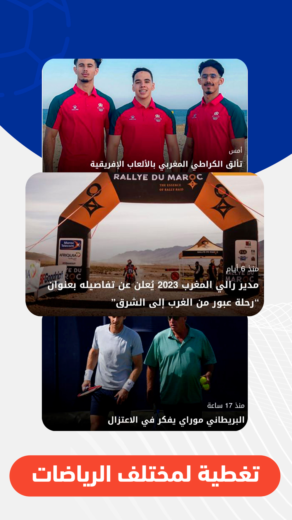 يقدم لكم التطبيق آخر الأخبار الرياضية، ويُمكنكم من تتبع مستجدات عالم رياضة كرة القدم والرياضات الأخرى (تنس، ألعاب القوى، سباق السيارات، فورمولا وان، الغولف، كرة السلة، كرة اليد..).