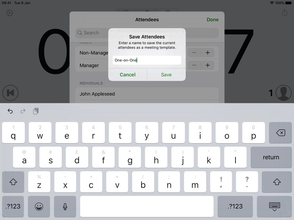 • Back up your currency, hourly rates, meeting templates and current meeting configuration to iCloud Drive, Dropbox etc. for safekeeping or to copy between your devices.