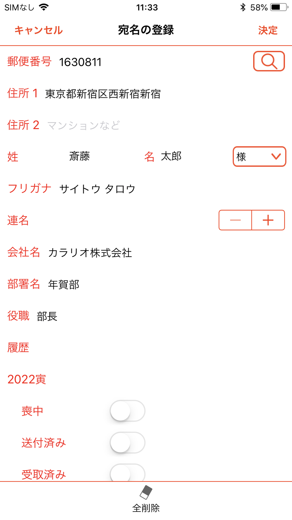 「送付済み」や「喪中」を住所録で管理することができます。また、会社名、部署名、役職の入力にも対応しています。