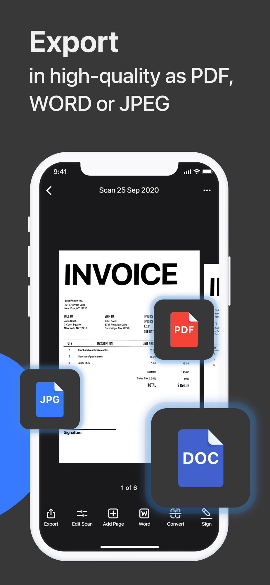 Scan, edit, sign and share any document in PDF or JPEG. With our scanner you don’t need an Internet connection as all scans are stored locally on your device.