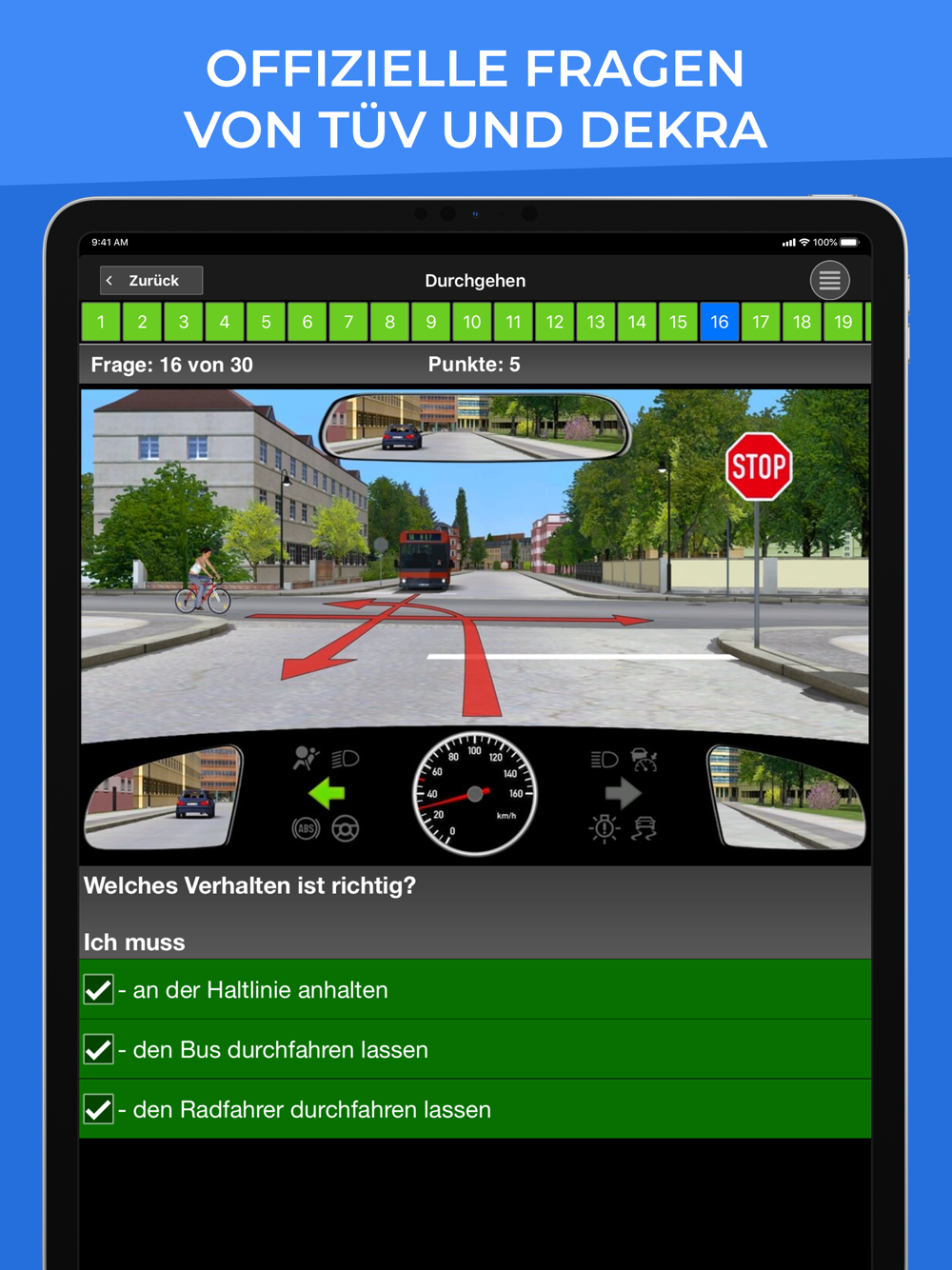 - Intelligentes Lernsystem. Der Auswahlalgorithmus berücksichtigt auf Grundlage früherer Antworten besonders die Führerscheinfragen, die du noch am meisten üben musst.