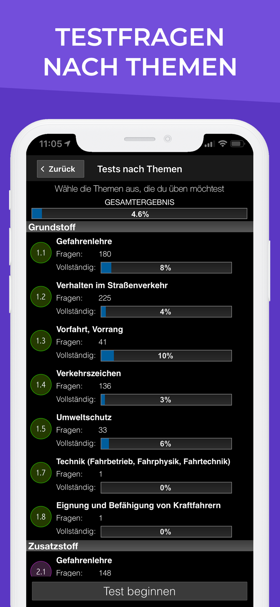 Prüfe dein Führerschein-Wissen in verschiedenen Themenbereichen. Du kannst dabei ein oder mehrere Themen und Tests mit 10, 20 oder 30 Übungsfragen auswählen.