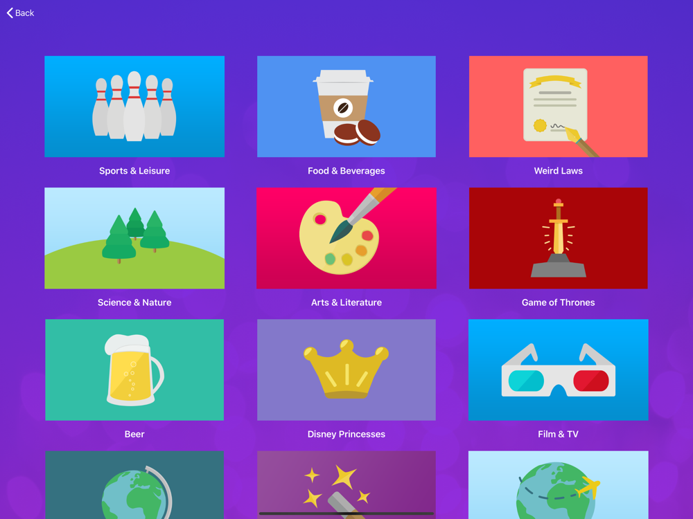 - Topics include Film & TV, Arts & Literature, History & Geography, Science & Nature, Sports & Leisure, Cats & Dog, Flags or the World, Food & Beverages, Weird Laws & more!