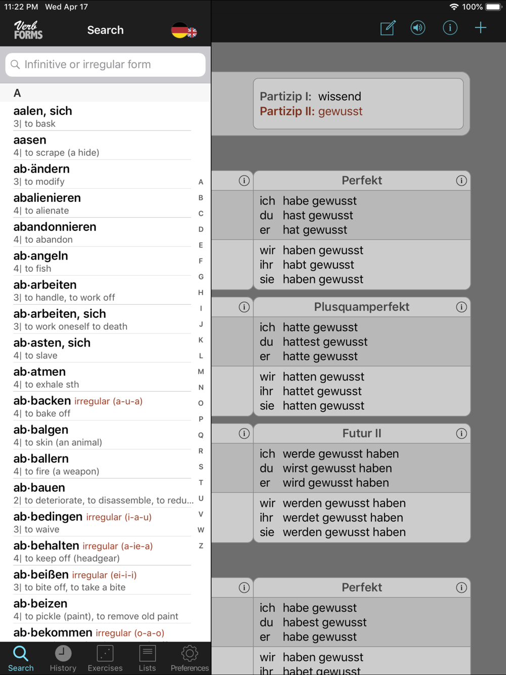 VerbForms Deutsch: reference, conjugation and vocabulary trainer for German verbs.
