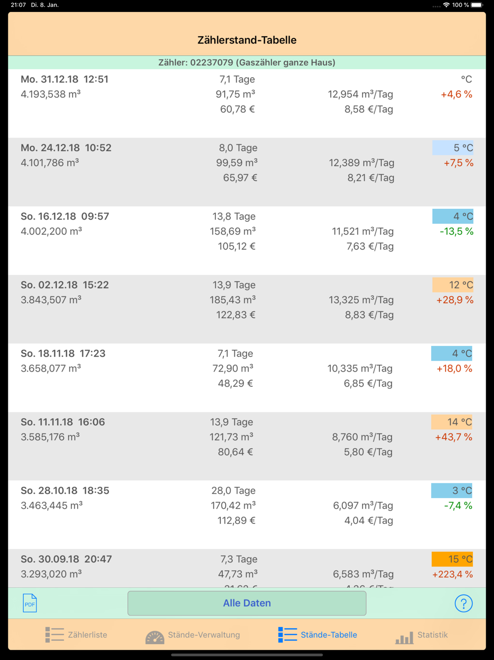 Meine Empfehlung ist 1 x pro Woche die Zählerstände eintragen und man bekommt schnell