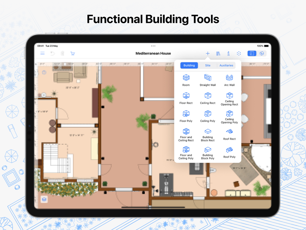 • Terrain editing tools for landscape design: create elaborate terrain with elevation lines and pits, lay driveways and plan out your garden or backyard.