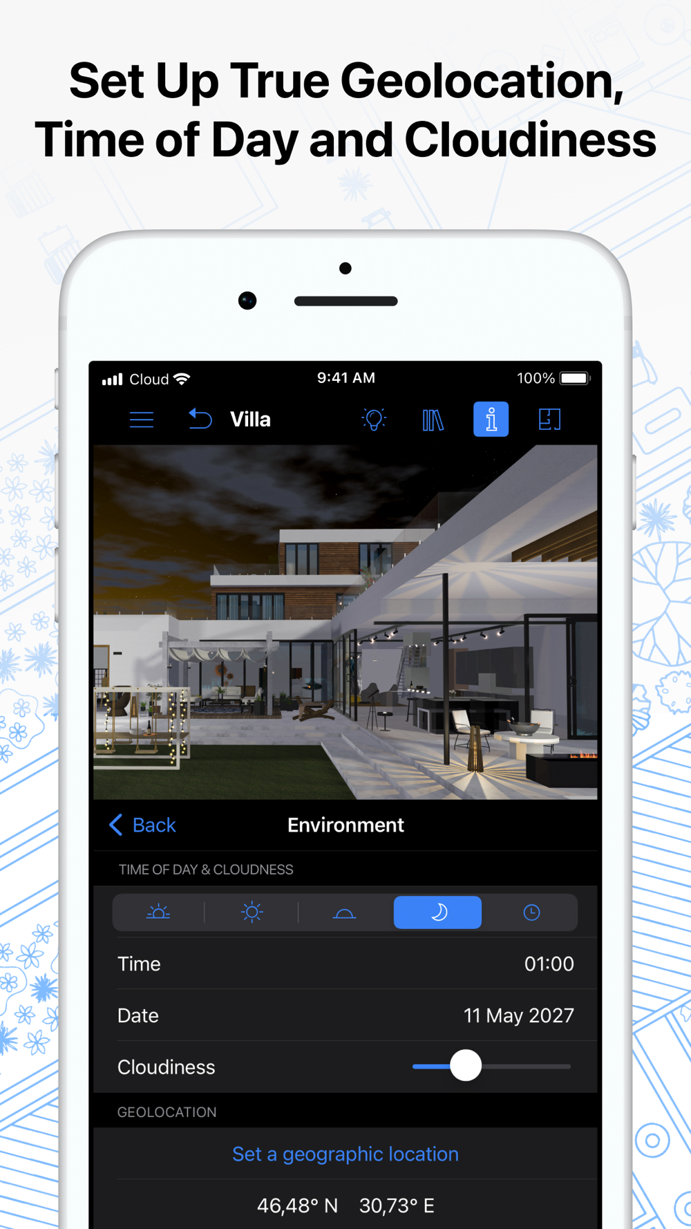• Achieve natural lighting by setting up true geolocation, time of day and cloudiness.