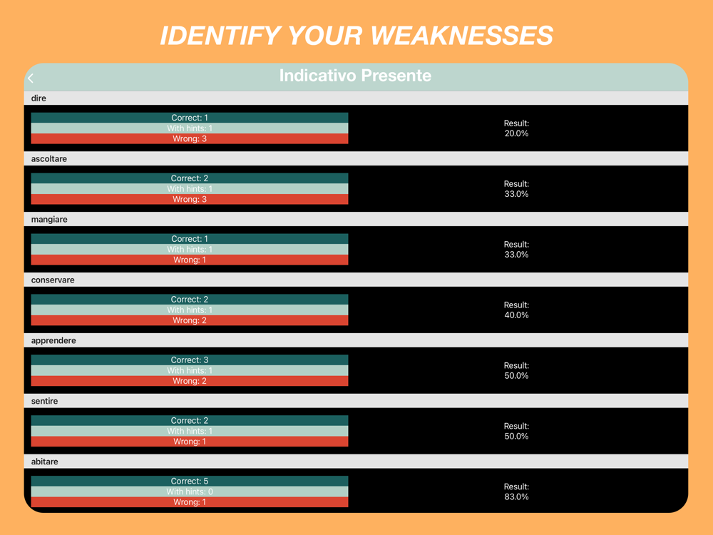 Stay motivated by tracking your performance. Detailed statistics for each verb tense will let you measure your achievements and see how far you've come.