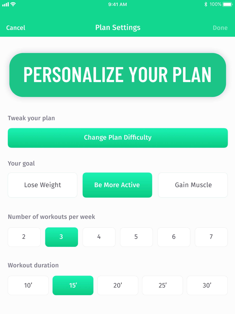 30 Day Fitness Challenge integrates with Health App, allowing users to automatically export exercise data from 30 Day Fitness Challenge to Health App, and to import body measurements data from Health App to 30 Day Fitness Challenge.
